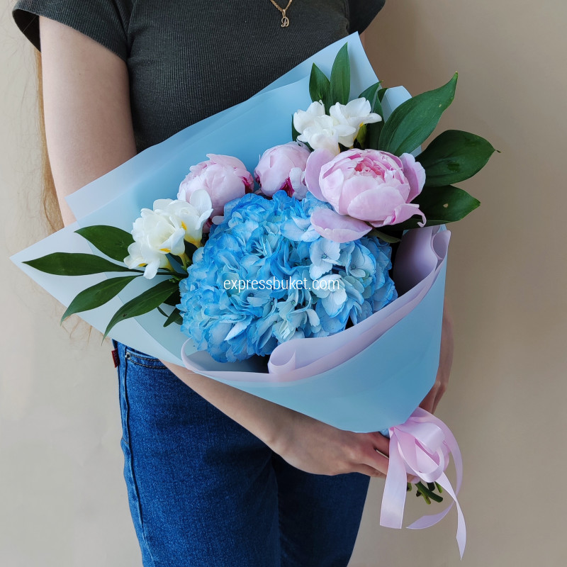 Гортензия - 1;Пион - 3;Лента атласная - 1;Современная упаковка - 1;Фрезия - 2;Русскус отеч. - 3;